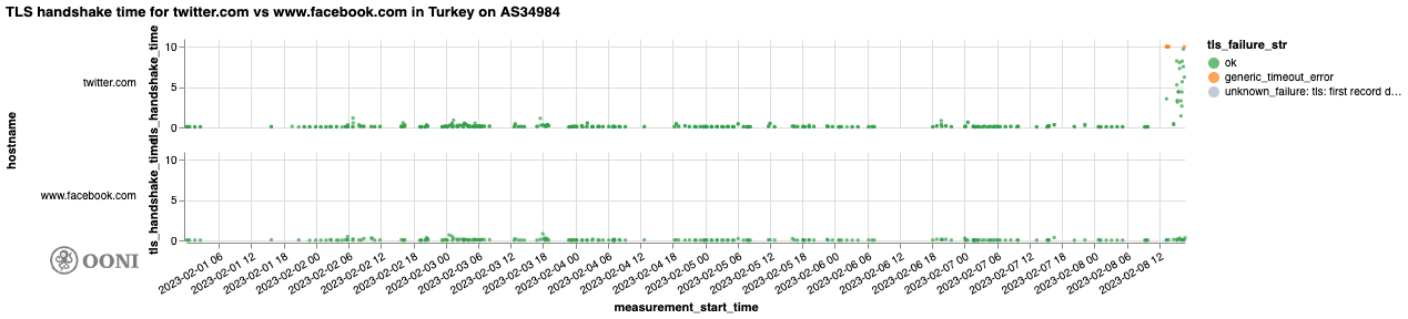 We can see that while the TLS handshake time for Twitter IPs was previously ~100ms on Turkcell Superonline (AS34984), it significantly increased to more than 3 seconds after 15:00 UTC on 8th February 2023.