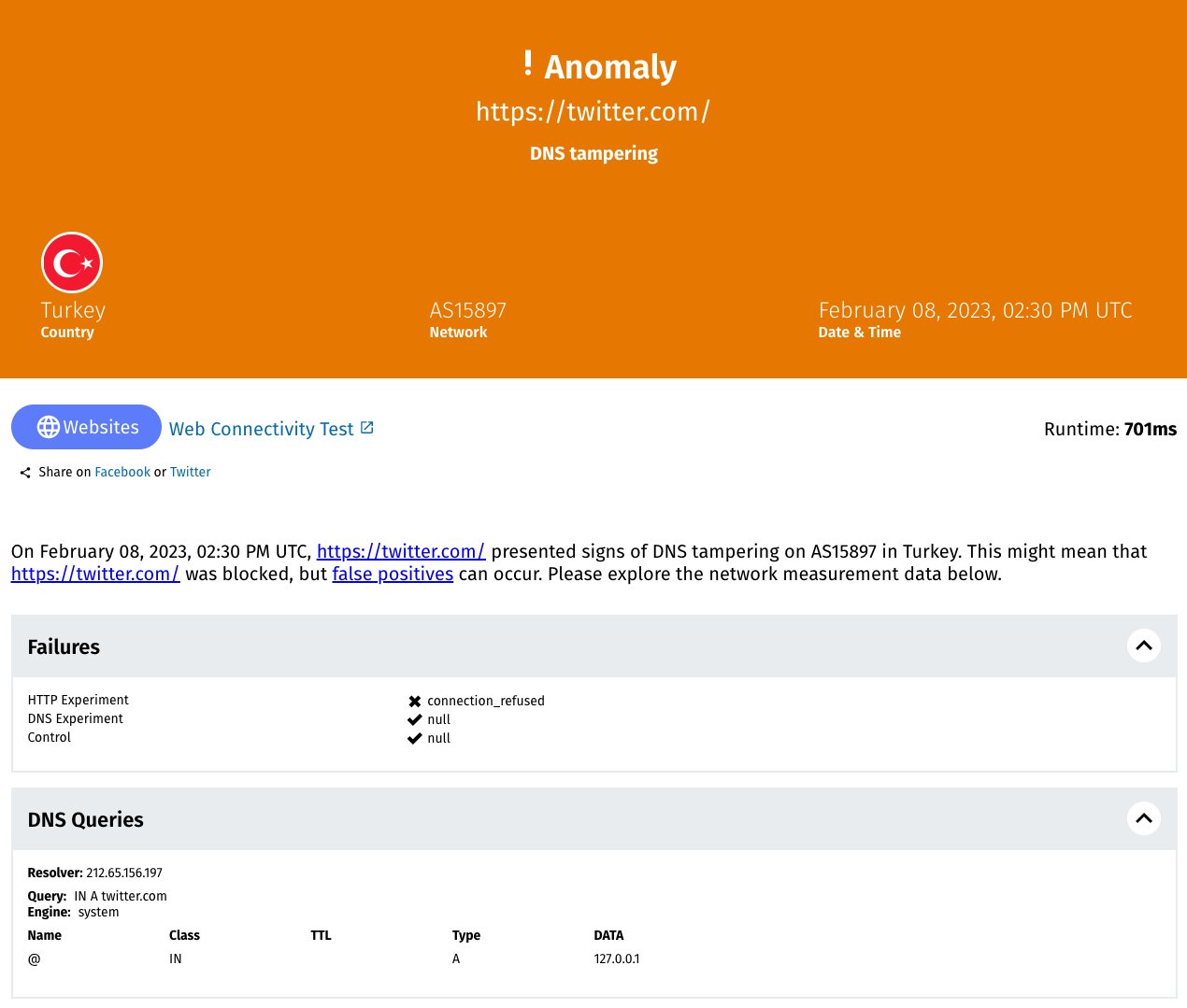 In the aftermath of the earthquake (on 8th February 2023), access to Twitter was reportedly temporarily restricted. OONI data collected from Turkey provides evidence that the block was implemented through targeted throttling and DNS interference.